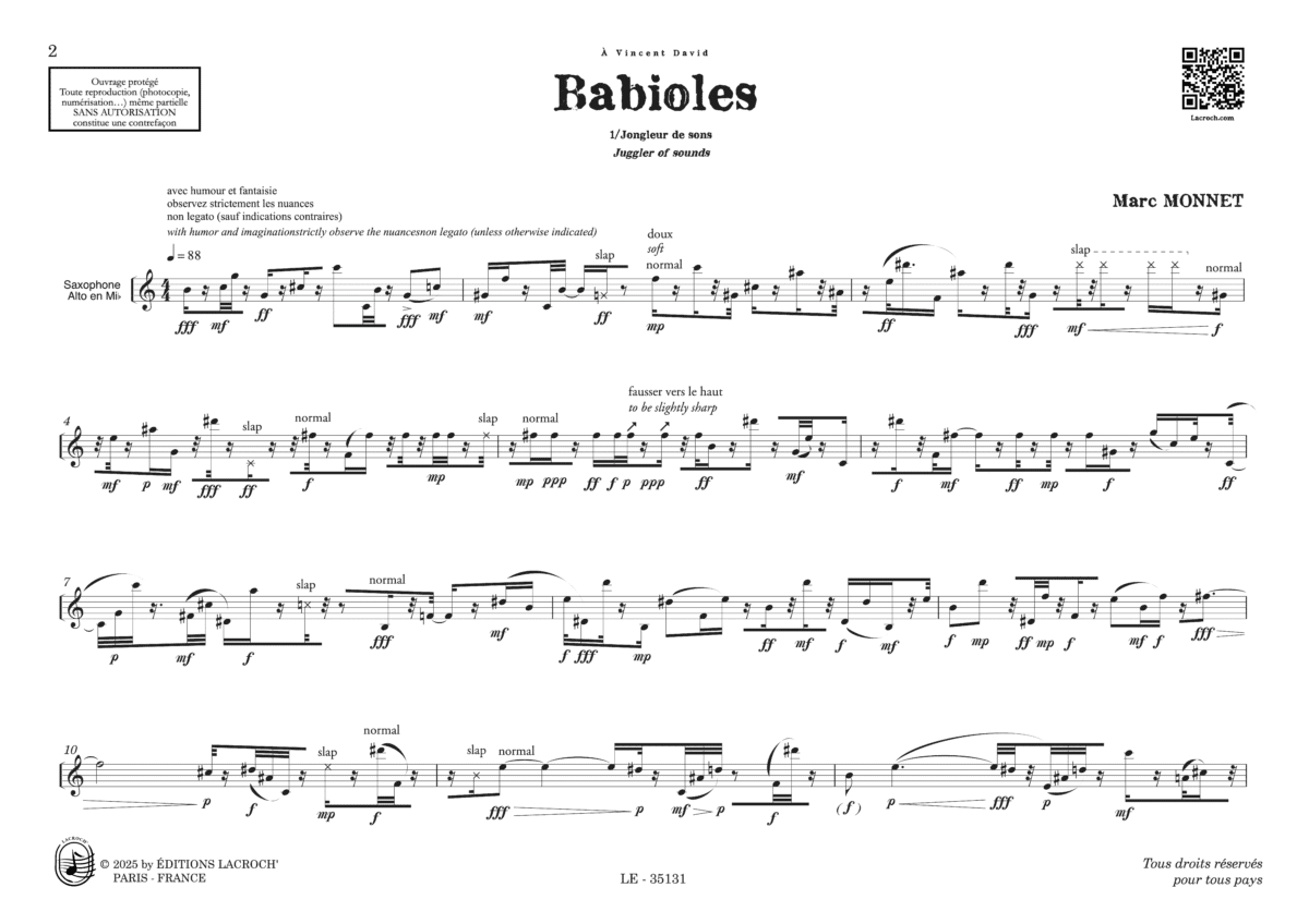 Tour à tour jongleur, contorsionniste ou gnome malicieux, le saxophone se prête à des métamorphoses sonores, à des équilibres suspendus, à des éclats de timbre inattendus. Cette écriture, d’une virtuosité extrême, évoque le monde du cirque : figures légères en apparence, mais portées par une exigence technique redoutable, où la virtuosité devient source de plaisir partagé.