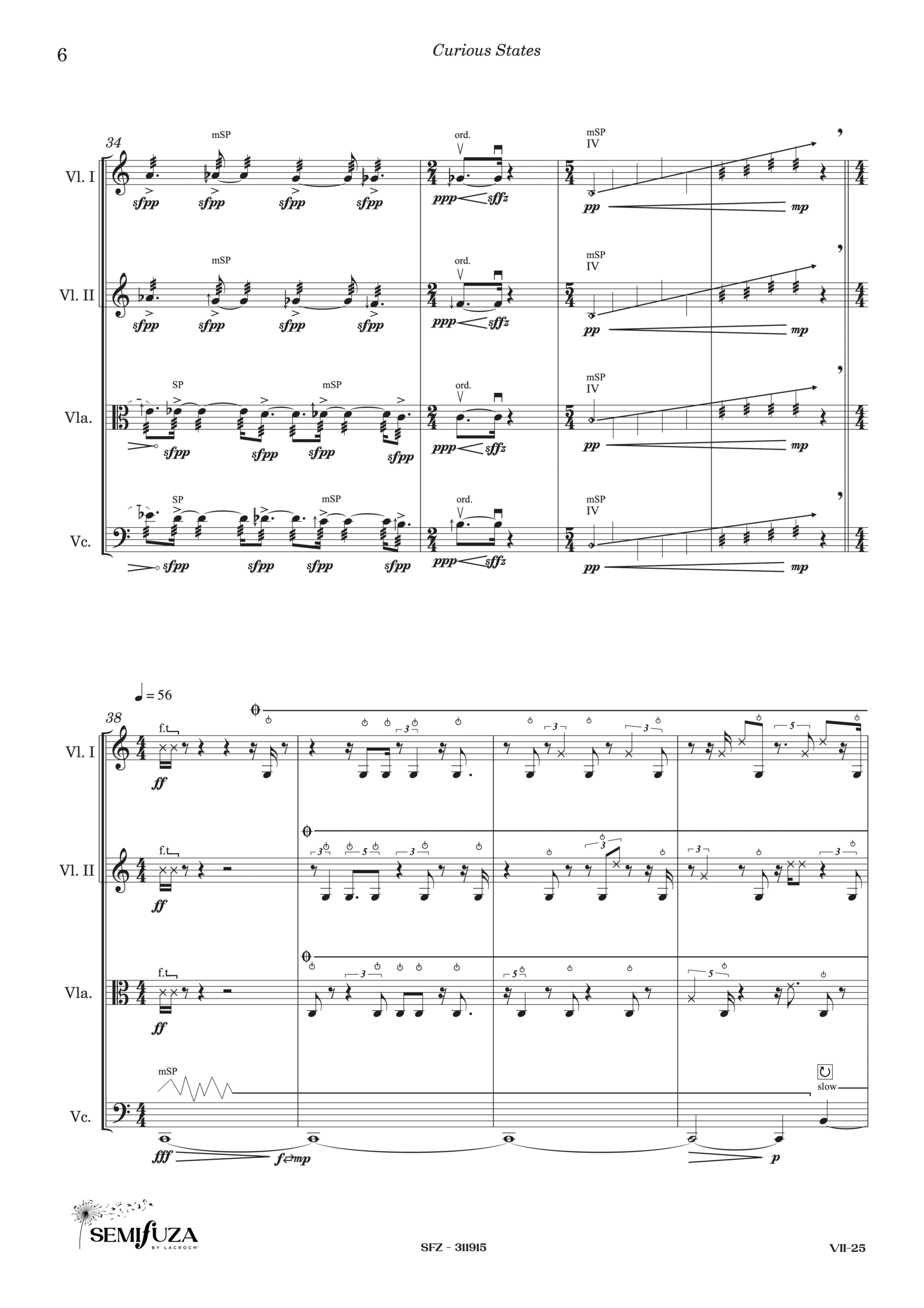 Curious States est une œuvre en trois mouvements — Aftershocks, Mischief, Dark — qui explore les potentialités sonores et expressives du quatuor à cordes. Bengisu Önder propose une démarche très expérimentale, mêlant techniques de jeu étendues, effets de timbre, micro-intervalles, et contrastes dynamiques, pour élaborer un univers musical riche en textures uniques et en atmosphères suggestives.