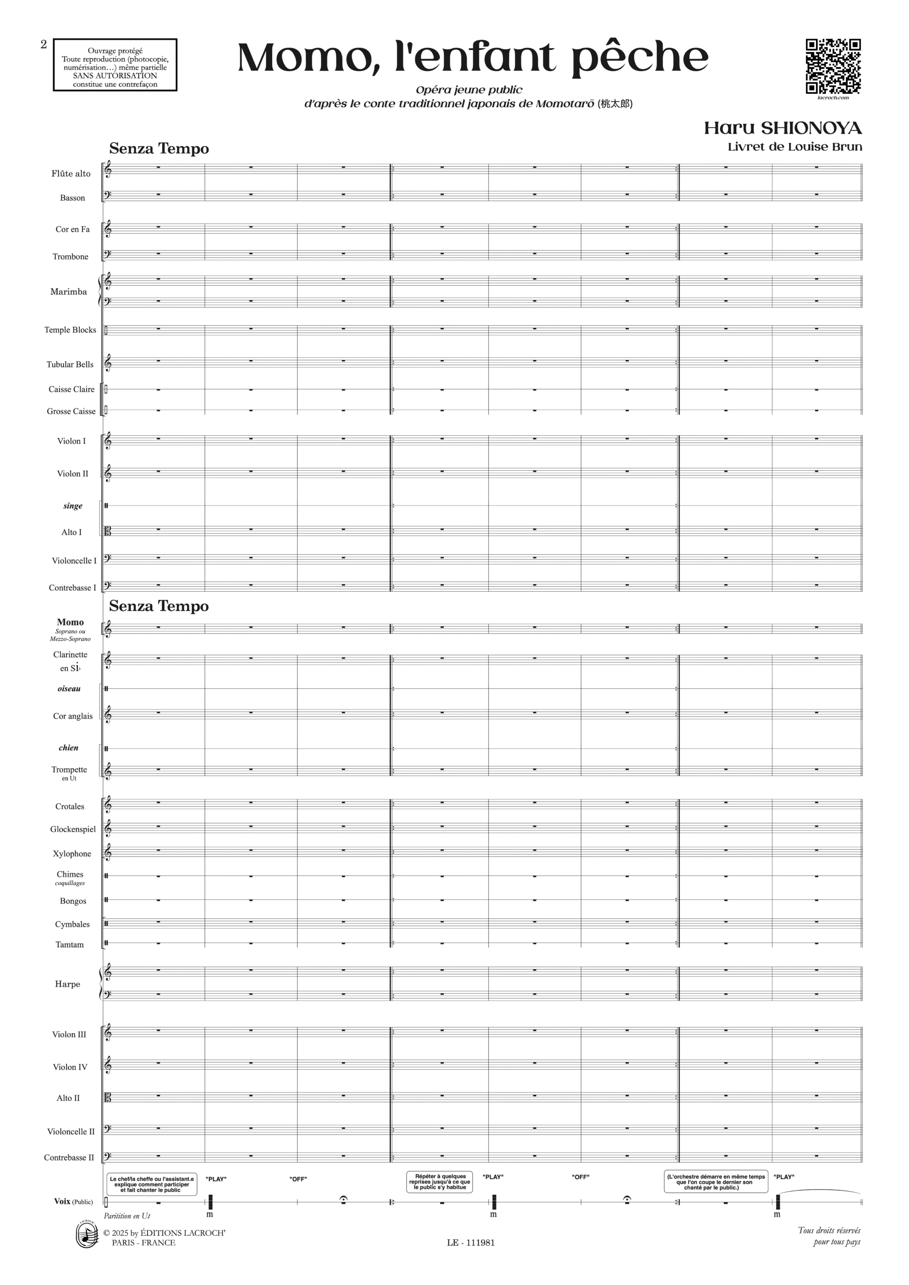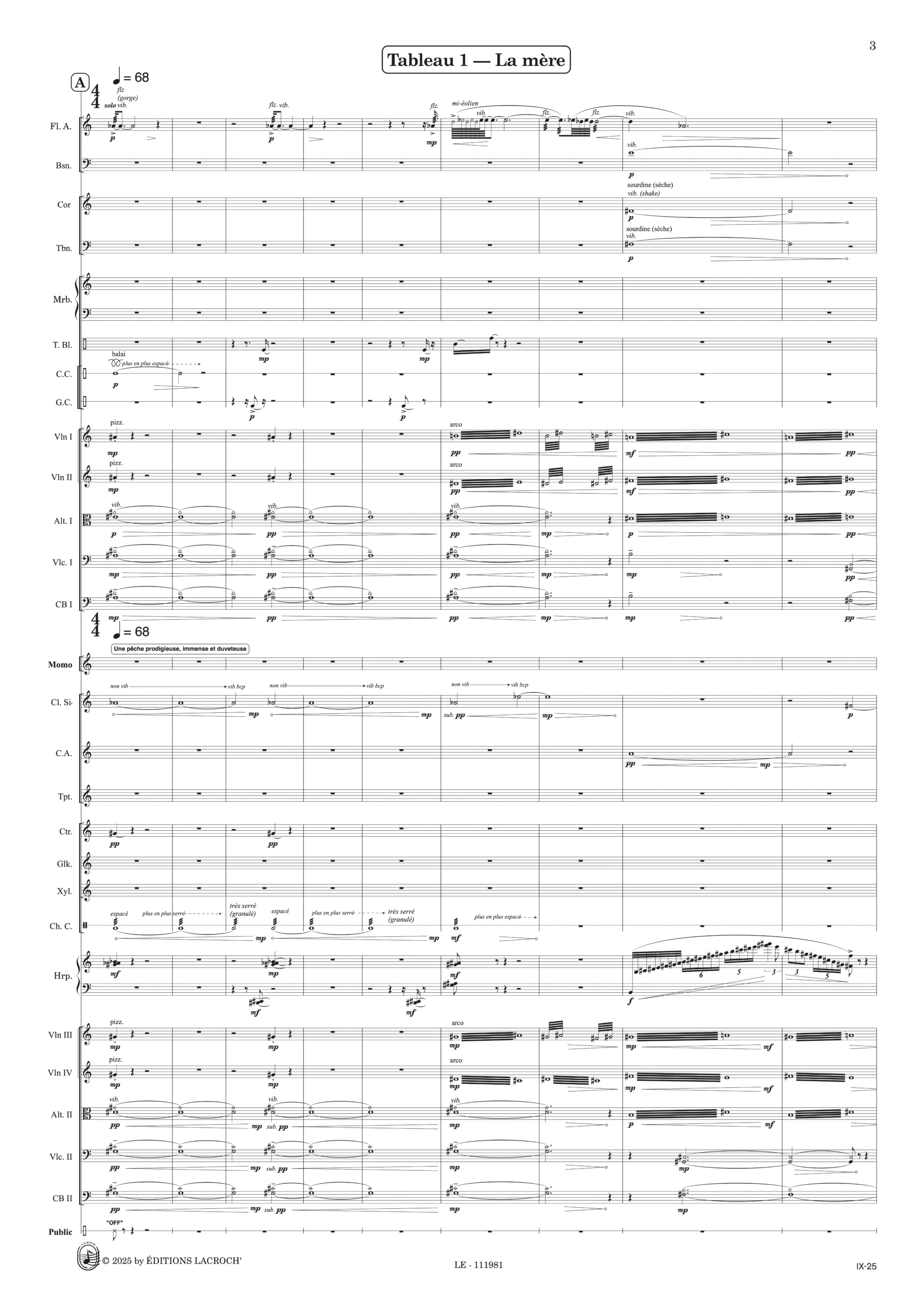 Effectif : Soprano, Orchestre I (1.0.0.1 – 1.0.1.0 – Perc. – 2.1.1.1), Orchestre II (0.1.1.0. – 1.0.0.0. – Perc. Hp. – 2.1.1.1.), Public (bouche fermée)