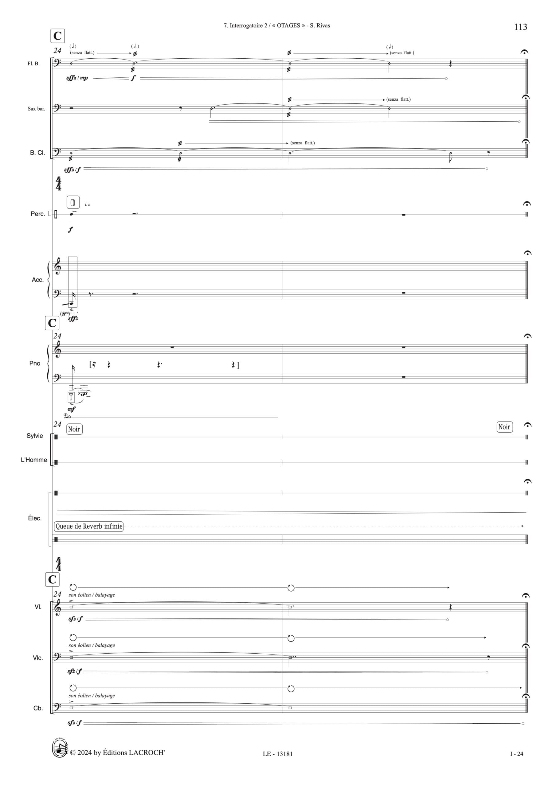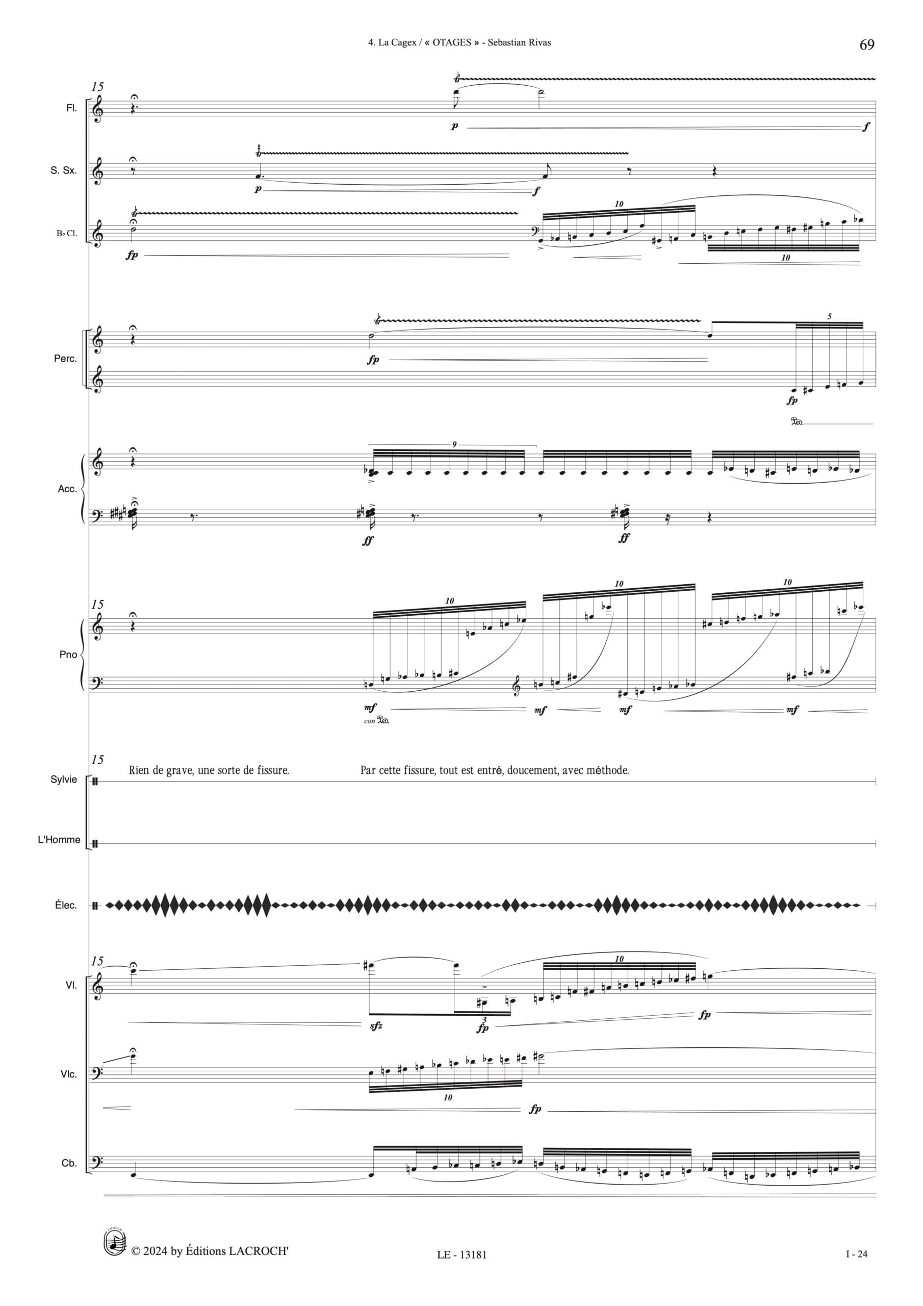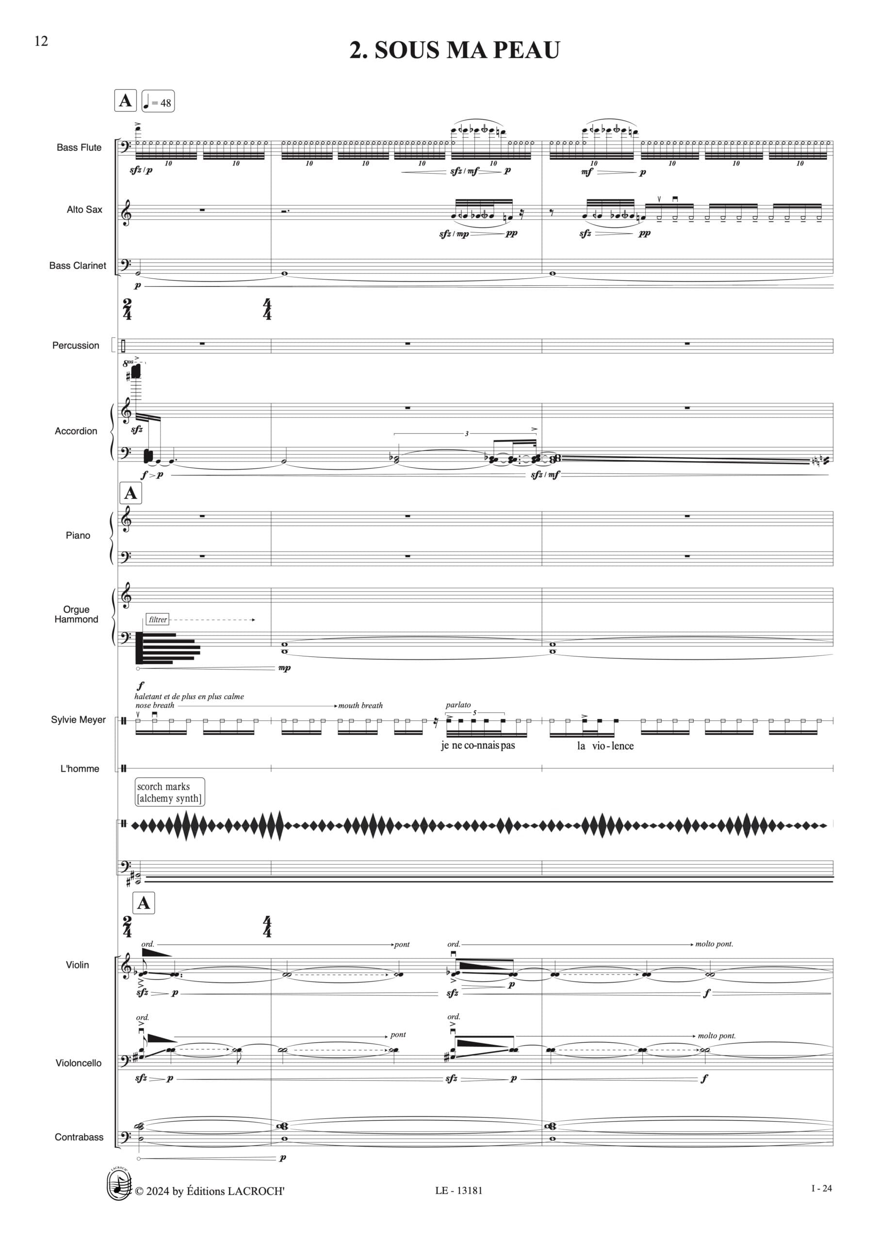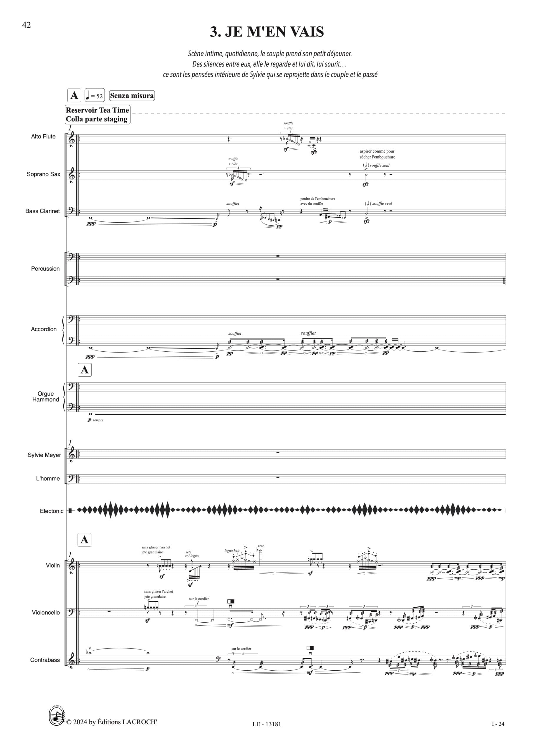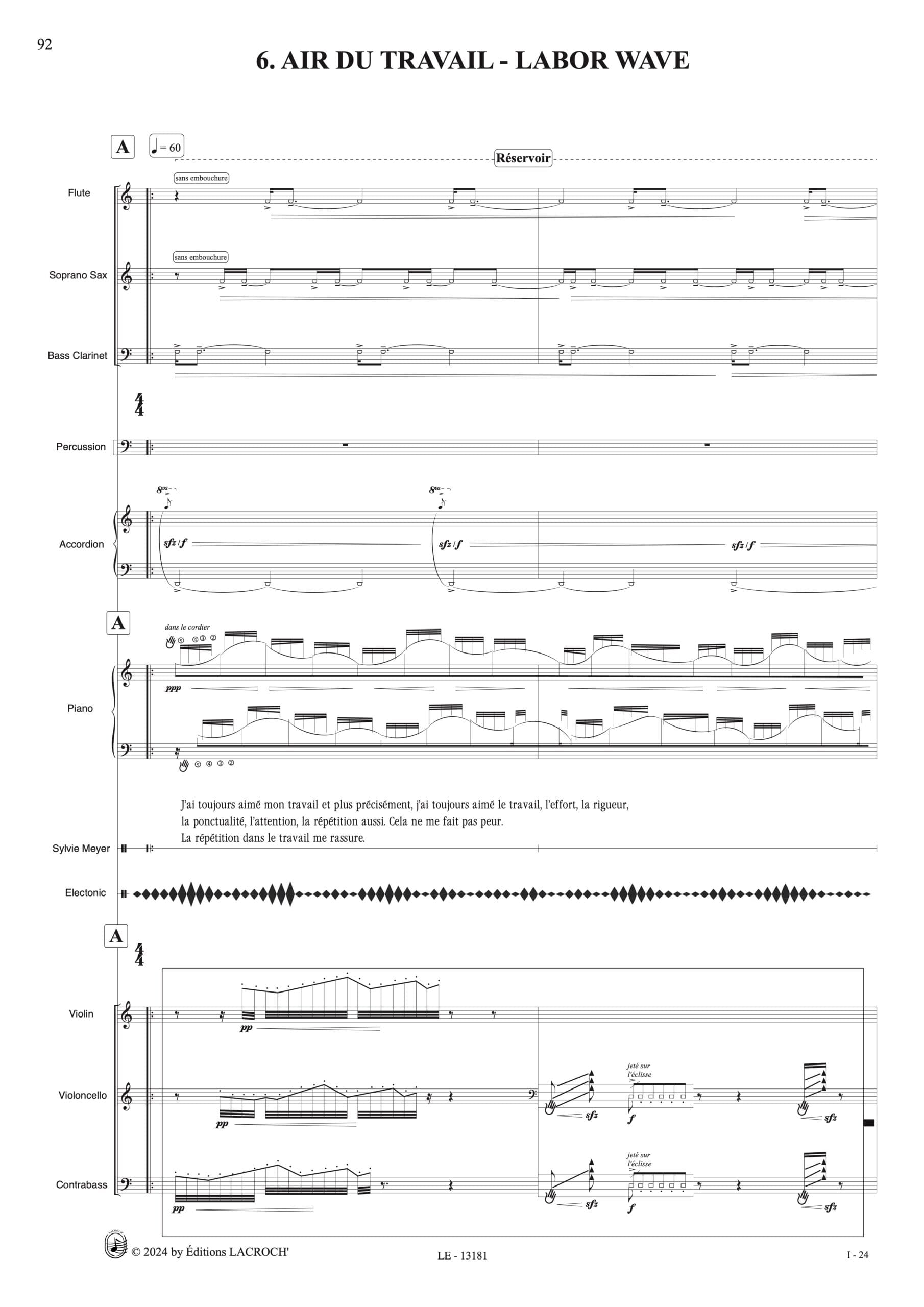 Effectif : 2 chanteurs (Sylvie Meyer – mezzo-soprano ; L’Homme – baryton), 9 musiciennes (Flûte, Saxophone, Clarinette, Percussion, Accordéon, Piano + Clavier MIDI, Violon/alto, Violoncelle, Contrebasse), et Électronique