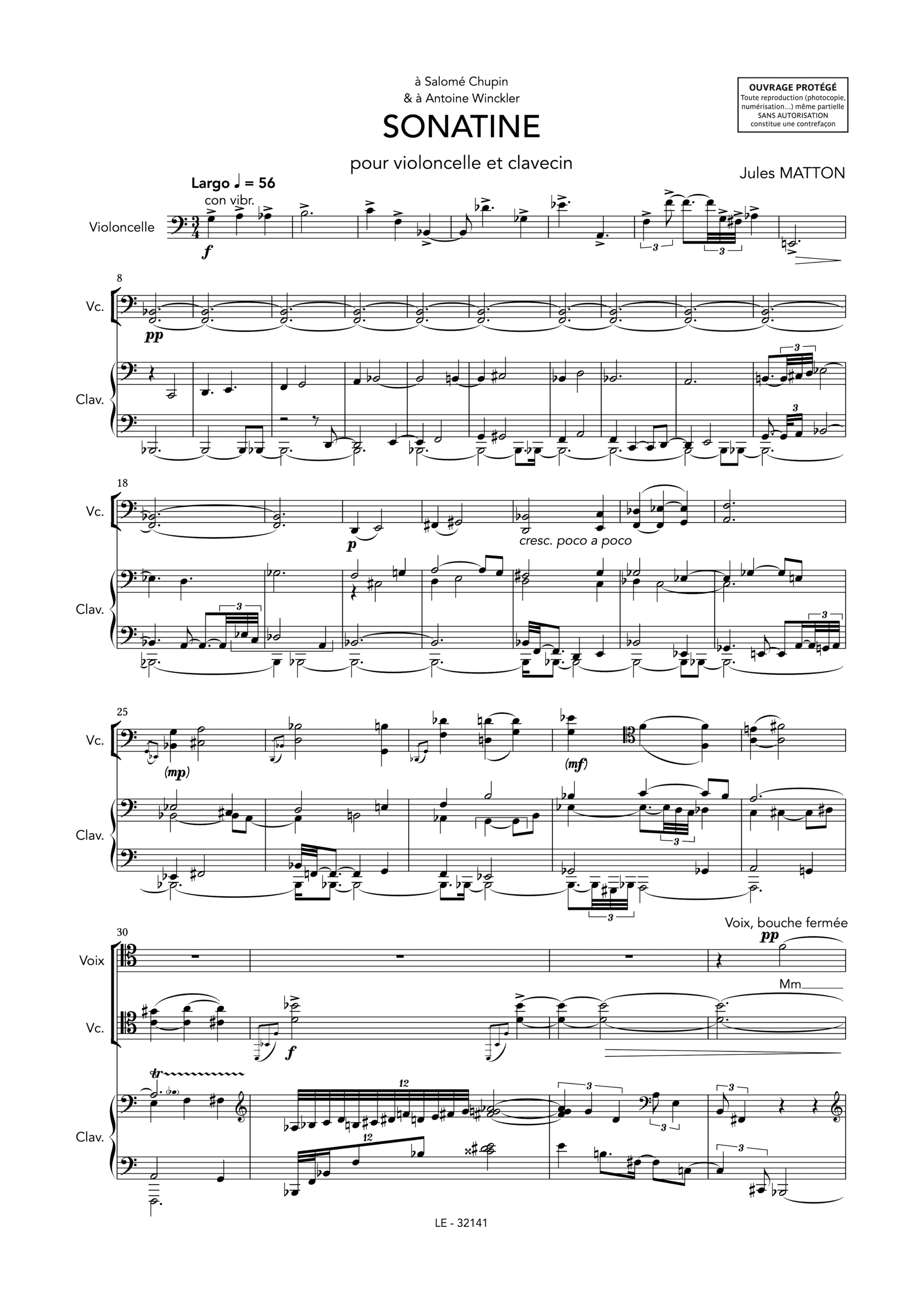 Écrite pour violoncelle et clavecin, la Sonatine de Jules Matton propose un dialogue singulier entre deux instruments que l’histoire musicale sépare autant qu’elle rapproche. Loin de toute référence néo-baroque, l’œuvre explore la friction entre la continuité lyrique du violoncelle et la résonance fragmentée du clavecin, conçu ici comme un véritable générateur de matière rythmique et harmonique.