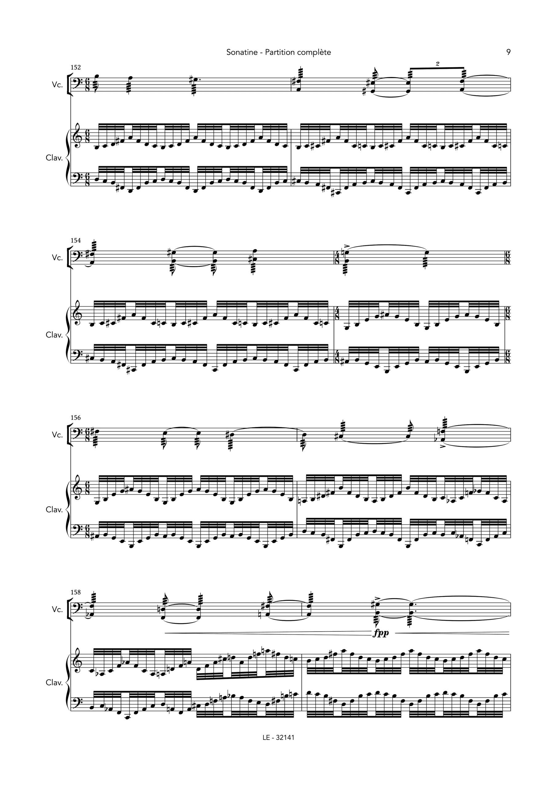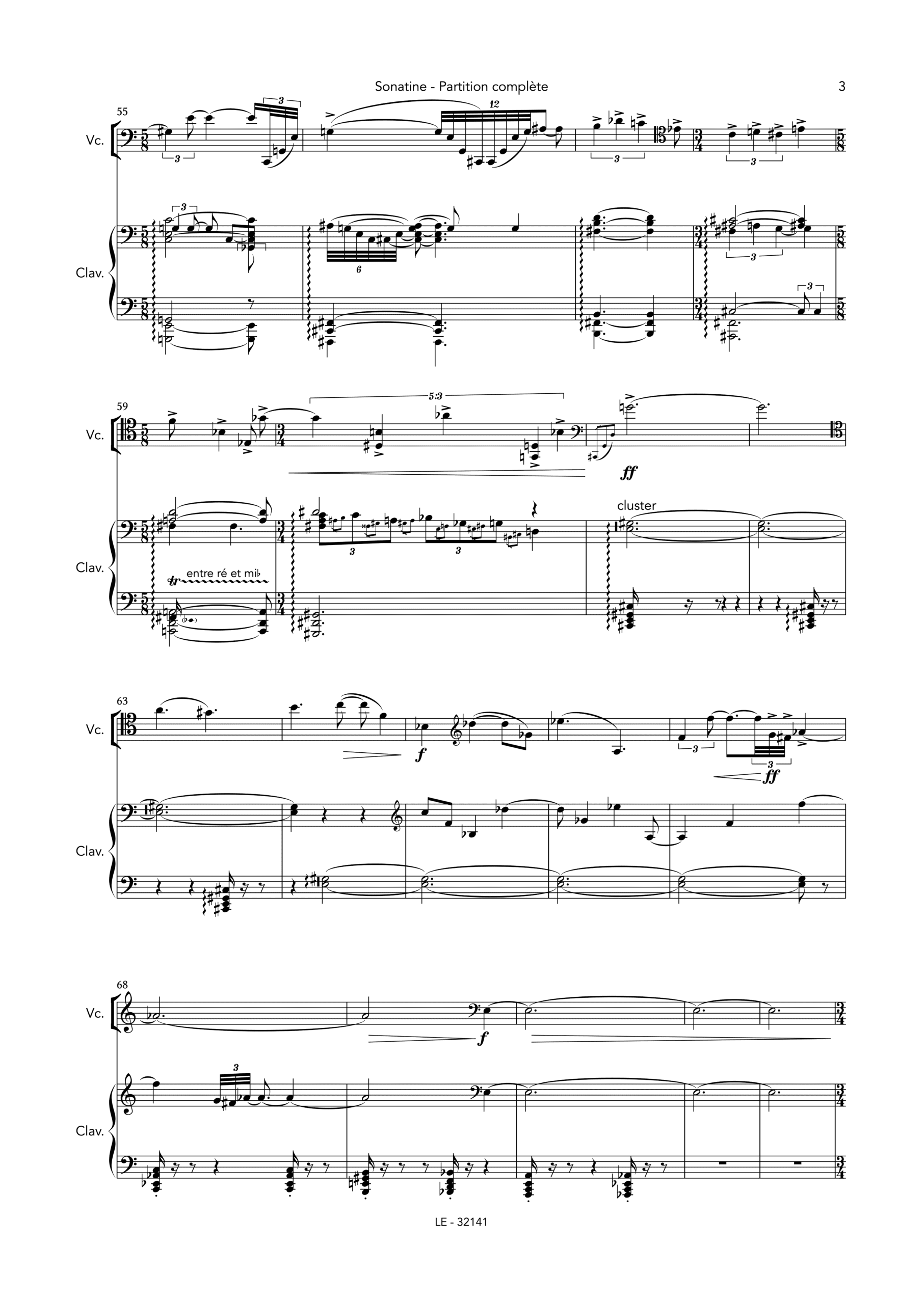 Structurée en plusieurs sections contrastées, la partition développe une écriture de la transformation progressive : nappes tenues, gestes répétés, surgissements rythmiques et zones de raréfaction s’y succèdent selon une dramaturgie fluide mais tendue. L’usage ponctuel de la voix (bouche fermée), intégrée comme prolongement timbral des instruments, élargit le champ sonore et brouille les frontières entre souffle, résonance et hauteur définie. La Sonatine se distingue par son exigence de précision, son attention au timbre et son sens aigu de l’équilibre, offrant aux interprètes un espace d’écoute et de tension partagé, au cœur d’une écriture à la fois rigoureuse et intensément expressive.