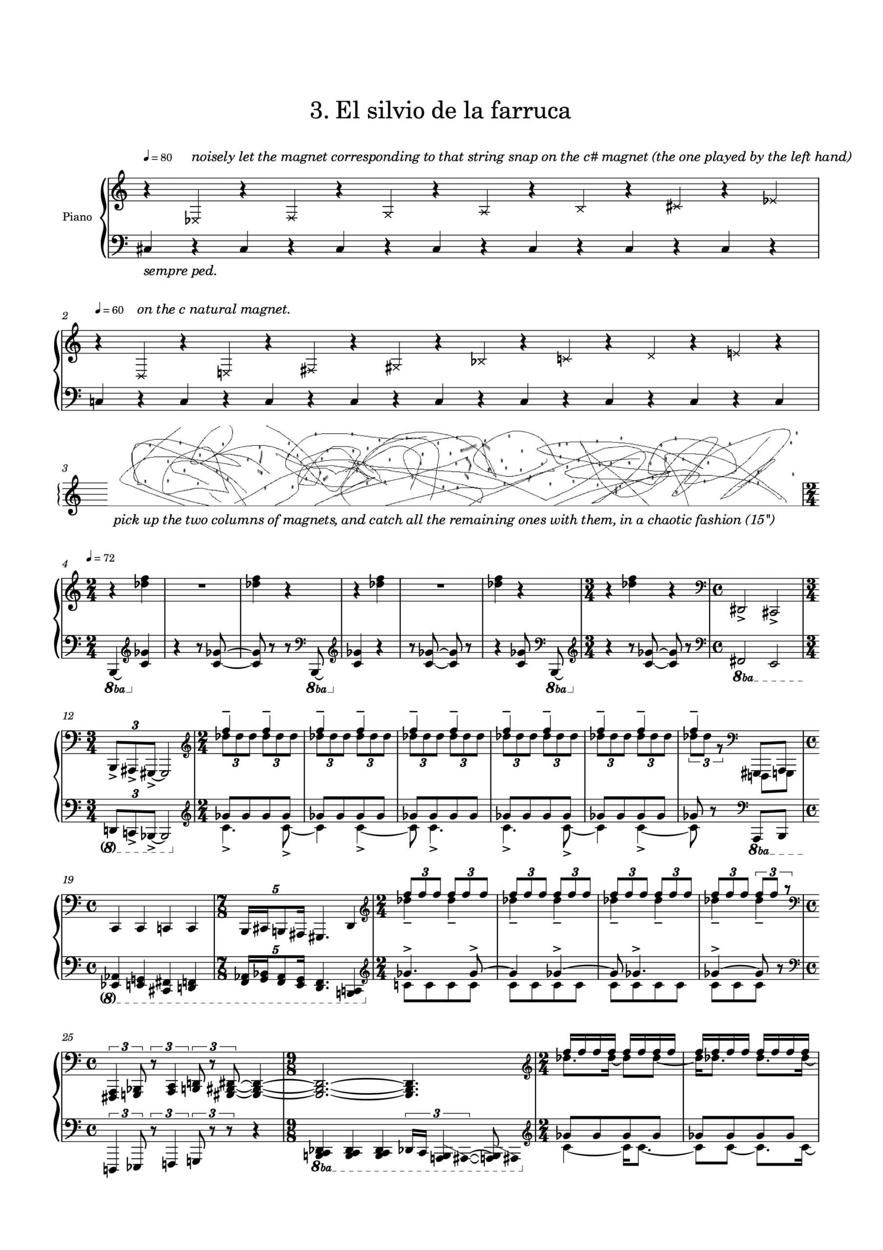 Une approximation de ces sons fut réalisée par la préparation du piano avec des aimants en néodyme placés à divers endroits, des languettes de caoutchouc et de la pâte adhésive. Tout le long de la pièce, l’univers sévère du jondo est exploré. Une première section évoque la Serenata Andaluza de Manuel de Falla, d’abord sous la forme d’un cante patrás (chant au service de la bailaora), qui se métamorphose en escobilla (épisode rythmique).