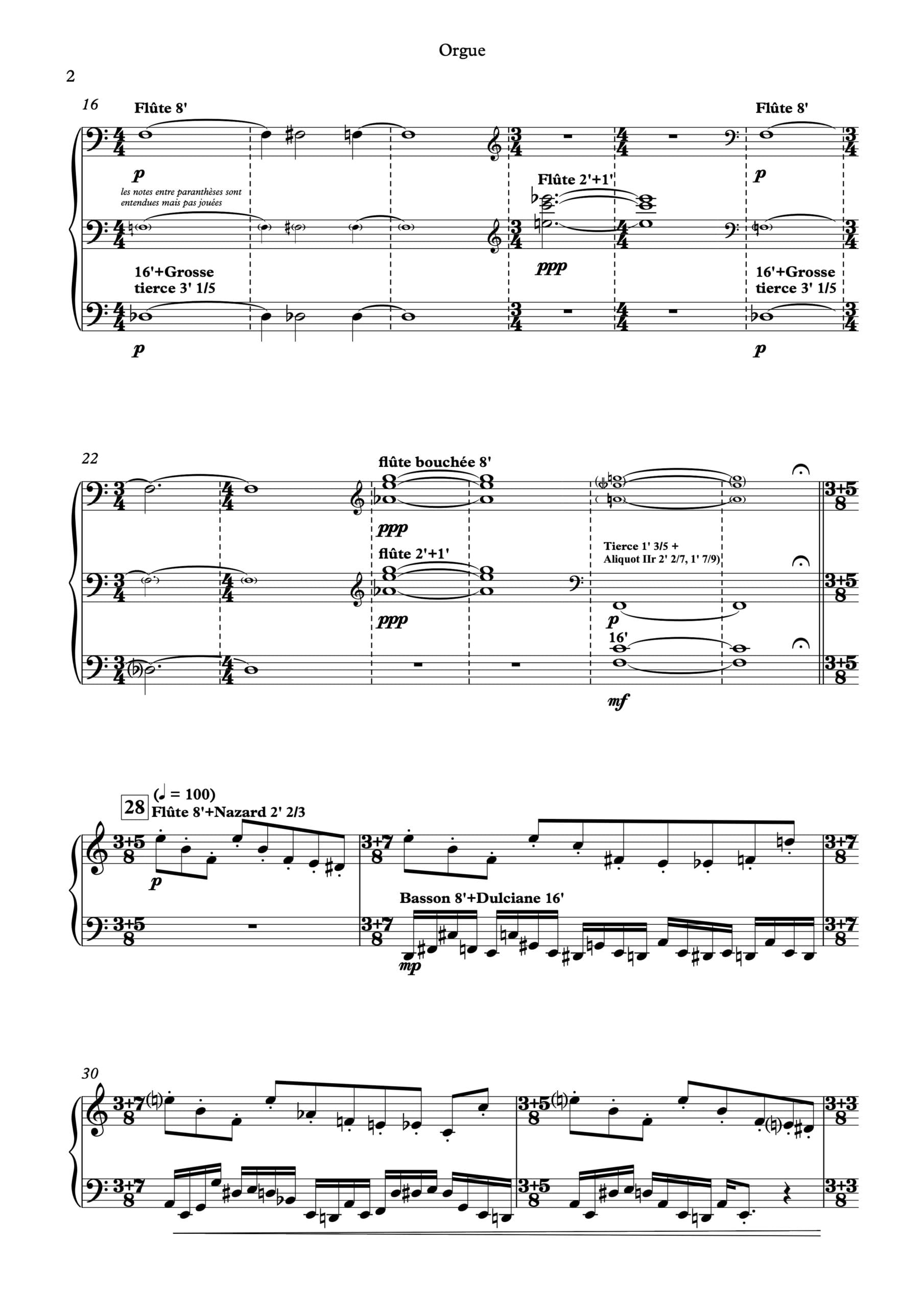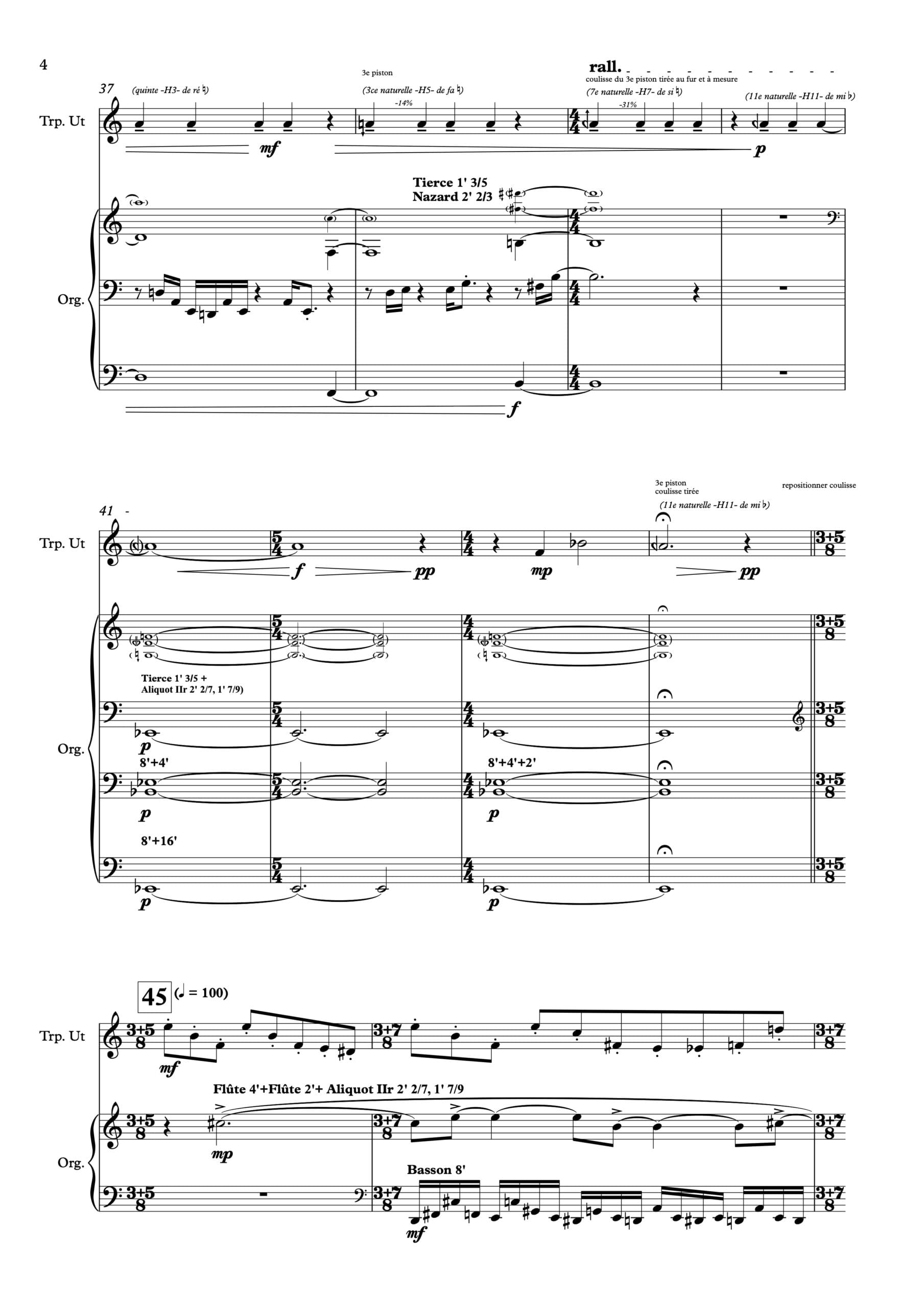 - Moment 1 : Introduction contrastée, dans lequel l’orgue joue un rôle de fond résonant, créant un espace acoustique large. La trompette intervient par brèves incursions (éclairs) jouant sur la pureté du son, les dynamiques fortes/faibles.
