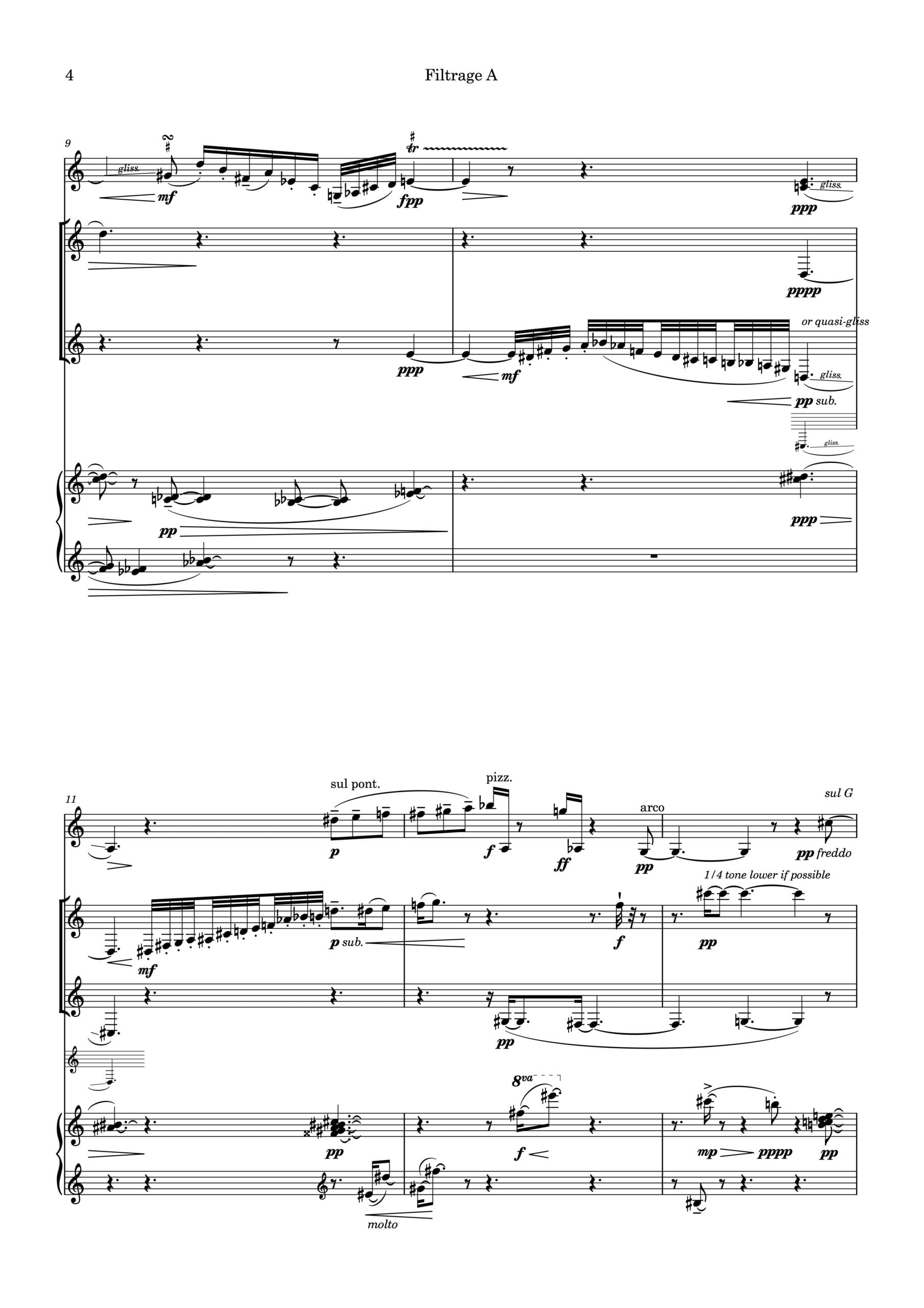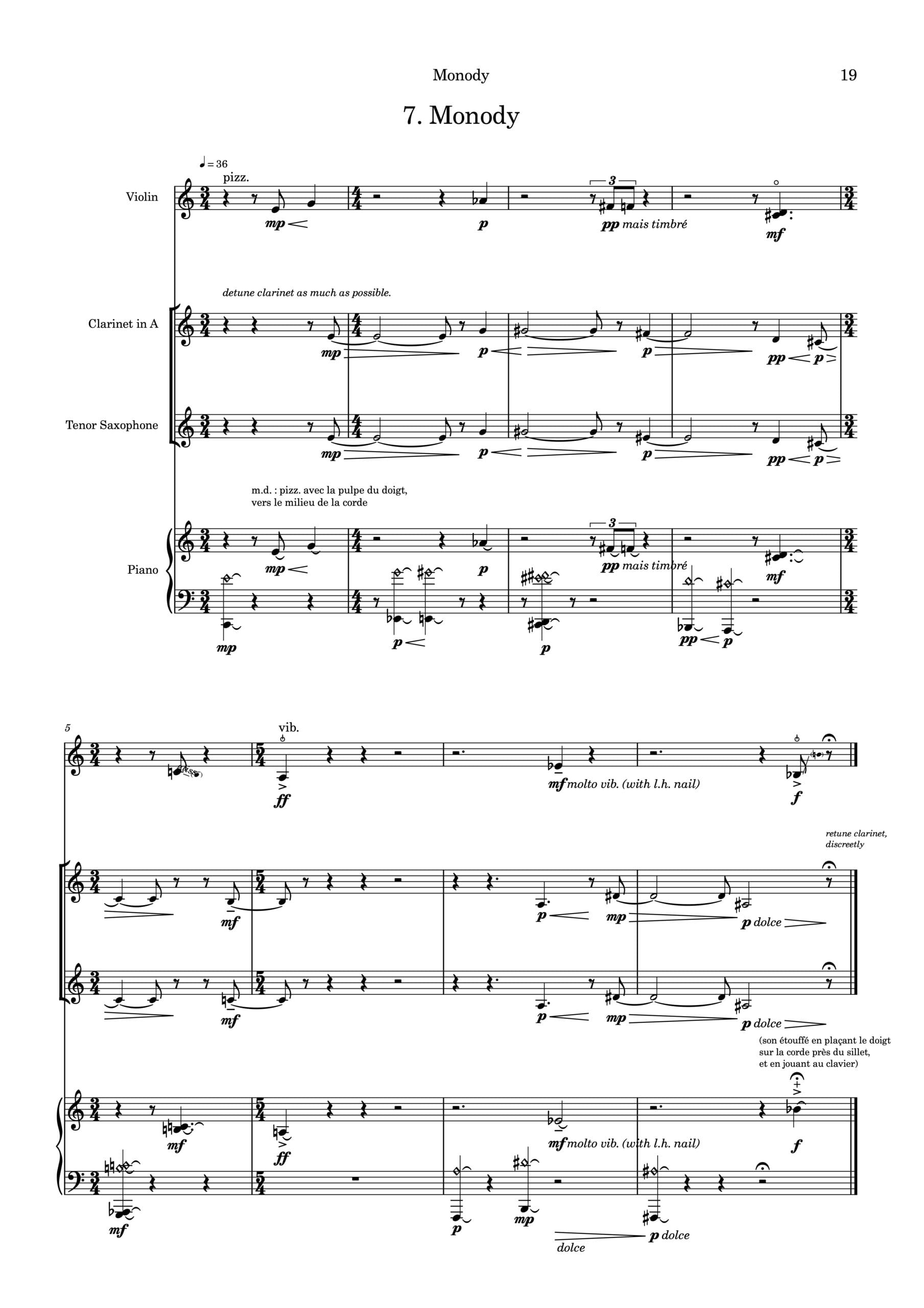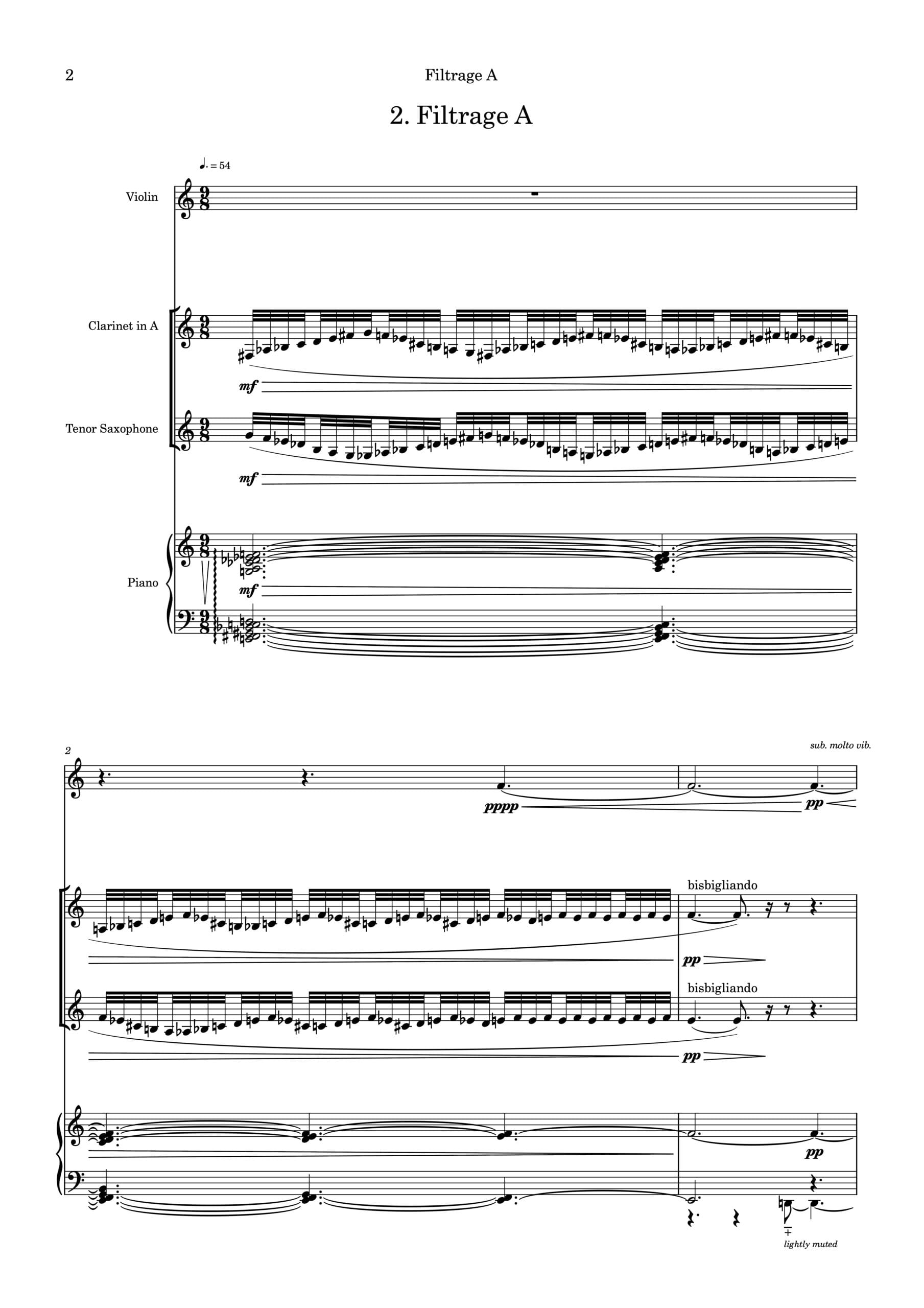 Frédéric Chopin’s Barcarolle Op.60 served as the starting point, first deconstructing it and then rebuilding the resulting fragments. A link was drawn with Anton Webern’s Quartet op.22, for violin, clarinet in A, tenor saxophone and piano. The content and instrumentation of Webern’s piece were used to ‘pollute’ the new musical elements.